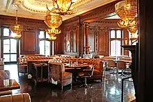 The Oak Room (originally called the Napoleon Drawing Room) is the most decorated room in the house, and was used for formal occasions. It is encased in wood panels in the style of Grinling Gibbons, which took three artisans three years to carve. The highly ornamented plaster ceiling was made by Italian craftsmen, and was enhanced by the use of indirect lighting in the ceiling. Among other fixtures, the room featured a 10 feet (3.0 m) high Louis XVI style faux-gilt carved light standard with 24 bulbs.[18][19][20]