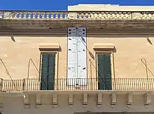 The Casa del Commun Tesoro is a large building with two stories. The façade is somewhat plain, and an open balcony runs along most of the first floor. The façade facing Republic Street contains a large sundial and calendar, which is unique in Malta. Its ground floor contains a number of shops, including Caffe Cordina.[18] The interior of the building includes a decorated ceiling, a grand staircase and a central courtyard.[4]