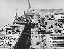 Casablanca-class carriers were built by the Kaiser Shipbuilding Company's Vancouver Yard on the Columbia River in Vancouver, Washington. The Vancouver yard was expressly built in 1942 to construct Liberty ships, but exigencies of war soon saw the yard building LST landing craft and then escort carriers all before the end of the yard's first year in operation. The yard had twelve building ways and a 3,000-foot (910 m) outfitting dock along with a unique additional building slip originally intended to add prefabricated superstructures to Liberty ships. Their relatively small size and mass-production origins led their crews to refer to them as "jeep carriers" or "Kaiser Jeeps" with varying degrees of affection.[4][5]