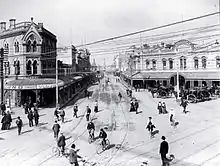 City Mall is the main pedestrian mall in the central city of Christchurch, New Zealand, comprising two sections of Cashel Street plus the Bridge of Remembrance and one section of High Street. It is also known colloquially as Cashel Mall.[1][2][3][4] The Bridge of Remembrance was pedestrianised in 1976. The main mall was closed to traffic on 11 January 1982 and formally reopened as a pedestrian mall on 7 August, but it was not until 1992 that the entire mall was paved. The mall was redeveloped between 2006 and 2009, and track was installed for an expansion of the heritage tram network.