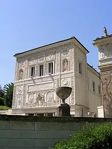 Upon Paul IV's death on 18 August 1559, Pope Pius IV took on the project, which had not yet been completed, and, turning to Pirro Ligorio, improved it. The complex, as it was completed in 1562, comprised an elliptical cortile, two free-standing portals, and the loggia with its fountain. Rich sculptural stuccos, once supplemented by some fifty ancient Roman sculptures, enliven the exterior (illustration).[1] A team of at least six major painters, including Federico Barocci, Federico Zuccari, and Santi di Tito and their assistants, frescoed the interiors.[2]