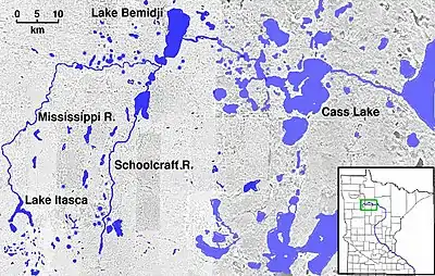 The lake occupies a basin that formed over a ground moraine on the lake's west side and glacial outwash on its east side[4] from melting glacial ice of the Wadena and Des Moines Lobes, respectively,[5] during the retreat of the Laurentide Ice Sheet after the Last Glacial Maximum. The Mississippi River flows through the lake from west to east. A second major stream, the Turtle River, enters the lake from the north. The lake has a large littoral area, particularly around Cedar Island.