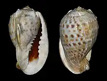 The shell is cone-shaped with a flattened apex, light with darker symmetrical spots. On the outer surface are small short spikes. The siphon (short and narrow) is strongly bent back. From the side of the mouth, the shell is white.[2] The size of an adult shell varies between 66 mm and 300 mm.