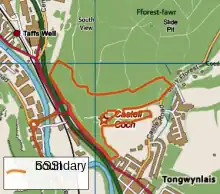 The SSSI (located at grid reference ST131827) covers an area of 17 hectares (42 acres) around the Victorian gothic castle of Castell Coch, 5 miles, 8 km north-west of Cardiff. The steep south and west facing slopes have extensive beech woodlands - thought to be the furthest west that such woods occur.[1] The mature beech woodland supports a ground flora that reflects the ancient nature of the woodland, with bird's-nest orchid, butterfly orchid, dog's mercury, ramsons and sanicle locally abundant.[1]