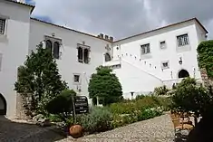 The first floor is the service floor, the second the reception area, and a bar in the eastern corp, while the remaining wings are taken-up by bedrooms.[1] In the third floor is the formal dining and living rooms, with the kitchen and bedrooms.[1] The two towers that flank the southern façade, of various dimensions and heights, are finished in pentagonal merlons (the tower of D. Fernando) and pyramids (the tower of D. Dinis), and were adapted into rooms. Over the door that connects the two courtyards is a passageway that connects the palace and the Church of Santiago.[1]