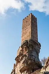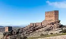 The castle stands on a large rock in the Vega de Zafra at an altitude of 1,400 metres (4,600 ft) in the Sierra de Caldereros. The upland area is characterised by sloping meadows interspersed with heavily-eroded sandstone outcrops, one of which is occupied by the castle.[3] It occupies the whole of the outcrop, which runs in a north-east to south-west alignment. A wall encloses the top of the outcrop, linking the entrance tower at the south-west end to the main buildings at the north-east end.[4] Traces of buildings – possibly part of an outer enclosure that might have incorporated structures such as stables or supply stores – can be seen in the meadow surrounding the castle.[5]