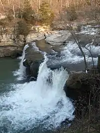 Cataract Falls consists of two sets of waterfalls on Mill Creek separated by about 1 mile (1.6 km). Both falls consist of a series of drops. The total height of the Upper Falls is approximately 45 feet (14 m), while that of the Lower Falls is about 30 feet (9.1 m).[1]