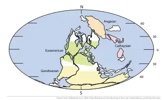 During the Permian Cathaysia/South China was located near the Equator and within the Paleo-Tethys Ocean together with the North China continent and these two small continents share what is often called the "Cathaysian floras and faunas" (in contrast to the "Gondwanan floras and faunas").[5] As North and South China collided during the Late Triassic the Qinling Ocean closed.[6] South China was covered with coal forests formed by seed ferns of the order Callistophytales, whilst tree-like Lycopodiophytes survived into the Permian.