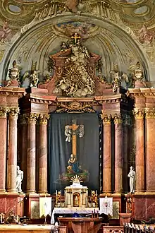 The pulpit is a monumental red marble structure with gilded wood sculptures. Cherub-like angels sit on the ledge with the symbols of the tetramorph. The balustrade is decorated with three gilt reliefs (The Good Shepherd, The Sower and Two Sons). An orb of flowers forms a hanging finial under rich garlands. There is sculpted relief above the door with a group of symbols: the Eye of Providence, a horn, a violin, a wreath and a palm branch. The underside of the abat-voix is decorated with a dove, and there is a sculptural group on the top depicting the Triumph of the Church over Idolatry. The figure of the Church is recognizable by the tiara on her head; she is holding a cross, a chalice and the tables of the law. Idolatry is shown as a recumbent male figure, desperately grabbing a little idol, and an ancient bust had fallen on the ground behind his back. The whole group is watched by a cherub playing the flute from the top of white clouds. The choice of topic is an allusion to the conversion of Hungary to Christianity by St. Stephen and the subsequent fall of paganism.
