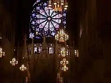 ![]() The Great Rose Window over the entrance to the Cathedral Basilica of the Sacred Heart in Newark, New Jersey is the largest of any Catholic church in the Western Hemisphere. | |