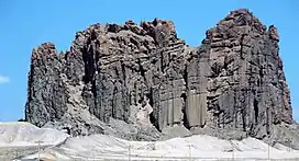 Cathedral Cliff is a 5,810-foot (1,770-meter) elevation volcanic plug located on Navajo Nation land in San Juan County of northwest New Mexico, United States.[3] It is a prominent landmark set alongside U.S. Route 491, approximately 13 miles south of the community of Shiprock, New Mexico. Cathedral Cliff is one of the phreatomagmatic diatremes of the Four Corners area, and with significant relief as it rises 400 feet (120 meters) above the high-desert plain.[4] It is situated about 9.5 miles (15.3 km) southeast of Shiprock, the most famous of these diatremes. Cathedral Cliff is set in the northeastern part of the Navajo Volcanic Field, a volcanic field that includes intrusions and flows of minette and other unusual igneous rocks which formed around 30 million years ago during the Oligocene.[5] Its nearest higher neighbor is Table Mesa, one mile to the southwest, and Barber Peak is set 1.5 mile to the southeast.