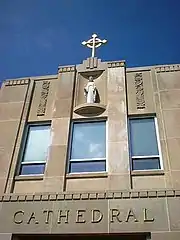 The sculpture Mary is mounted in a limestone niche on the main school building facade. Created by an unknown artist in 1963, the 60-by-25-by-16-inch (152 cm × 64 cm × 41 cm) statue is painted and appears to be made of concrete. The statue is a full-length robed representation of the Virgin Mary, standing with her hands outstretched with her palms facing upwards. The sculpture was surveyed in 1994 by the Smithsonian's Save Outdoor Sculpture! survey program and its condition was described as needing treatment.[13]