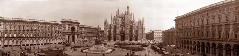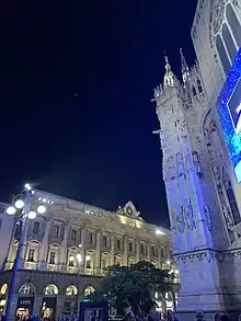 Piazza del Duomo ("Cathedral Square") is the main piazza (city square) of Milan, Italy. It is named after, and dominated by, Milan Cathedral (the Duomo). The piazza marks the center of the city, both in a geographic sense and because of its importance from an artistic, cultural, and social point of view. Rectangular in shape, with an overall area of 17,000 m2 (about 183,000 sq ft), the piazza includes some of the most important buildings of Milan (and Italy in general), as well some of the most prestigious commercial activities, and it is by far the foremost tourist attraction of the city.