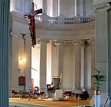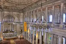While often likened, at least in its outward form, to St Paul's Cathedral in London, it is conceivable that the greatest influence behind this structure was Benoit Haffreingue. During Petre's formative years, Haffreingue had been the driving force of the reconstruction of the Cathedral of Notre Dame in Boulogne-sur-Mer, a French church that has a very similar plan to that of the Cathedral of the Blessed Sacrament, including the controversial siting of the dome over the altar rather than the centre of the cathedral.[16] Haffreingue was also the principal of a private Jesuit boarding school for boys (now known as "Le collège Haffreingue-Chanclaire") in Boulogne-sur-Mer. Petre was a student at this school in 1860–186, during Heffreingue's tenure.[17] The building was also said by some to be based on the 19th-century Church of Saint-Vincent-de-Paul, Paris, to which it bore some striking similarities.[2] The similarities to another great French church, Saint-Sulpice, Paris (17th century), have also been remarked upon.[18]