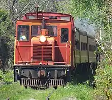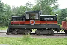 CMRR No. 29, "The Goat" is an Ex-Navy 50 ton H. K. Porter, Inc locomotive, which was a backup engine and main engine for work train service. It has a double-reduction gearing system in the trucks. The traction motors are mounted at 90 degrees to the axles and have bevel pinions on the armature shafts. These bevel pinions drive a larger bevel ring gear in a gear case. On one truck, the locking nut on the traction motor armature shaft came loose, and the bevel pinion jammed in the ring gear, locking up the truck. The bevel pinion jammed against the ring gear and bent it. #29 is currently for sale and remains in storage in Phoenicia.