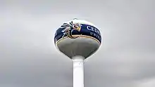 The water tower of Cedarville University is a landmark on the university campus in Cedarville, Ohio. First erected in 1983,[50] the water tower underwent a $55,000 renovation in 2015.[51] The water tower is located behind Cedarville's athletic center and bears the school's mascot, a yellow jacket named Stinger, along with the university's stylized text logo. The aesthetic elements were added in the 2015 renovation by H2O Towers of Saline, Michigan. The job was completed in four days using high-gloss paint manufactured by Tnemec.[52] The water tower can be seen over Cedarville University by southbound drivers on Ohio 72.[53] The tower serves as a landmark for one of the university's emergency telephones.[54]