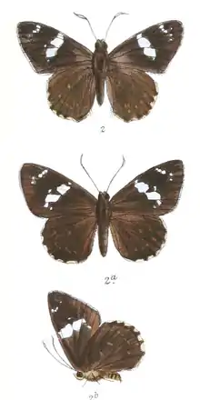 - 1 2 3 Evans, W.H. (1932). The Identification of Indian Butterflies (2nd ed.). Mumbai, India: Bombay Natural History Society. p. 326, ser no I11.17.