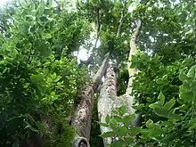 Growing as an individual tree in the open and under favourable conditions, Celtis africana becomes a tree of medium height, typically up to 12 m or so. It then usually forms a dense, hemispherical canopy. The bole of a mature tree then is thick and buttressed, often forked fairly near the ground. In forest it may grow up to 25 m tall, with a single, clean bole, though such large specimens usually are more or less buttressed too. In an exposed, rocky position it may be a bonsai-like small shrub. The trunk has a smooth, pale grey to white bark that may be loosely peeling in old trees and commonly has horizontal ridges.[5]