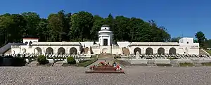 The necropolis complex was designed by Rudolf Indruch, an architecture student from the Lviv Polytechnic whose project won the competition.[3] The most visible element was a domed chapel which towers over the tombs underneath.[3] Exhumed remains of the 72 fighters were put in catacombs located between the chapel and the tombs.[3] In addition to Polish fighters, this part of the cemetery also has graves and monuments to American (pilots from the Kościuszko Squadron) and French volunteers who fought on the Polish side, two monuments were dedicated to those Polish foreign allies.[3] Underneath, an inscription "Mortui sunt ut liberi vivamus" ("They died so we could live free") was engraved on a semi-circular colonnade monument.[3] A triumphal arch was flanked by two stone lions.[3] The necropolis was never finished; its construction continued until the outbreak of the Second World War.[3] Out of almost 3,000 tombs, 300 were dedicated to the Eaglets, as the young Polish defenders of the city from 1918 are known.[3] In 1925 the ashes of one of the unknown defenders of Lwów were transferred to the Tomb of the Unknown Soldier in Warsaw.[4]