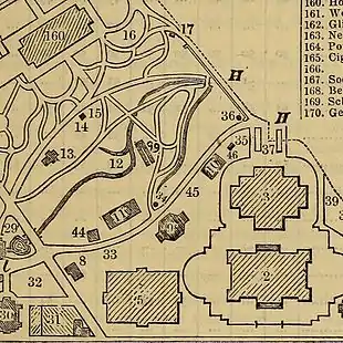 Cropped 1876 map of the Centennial Exposition. The comfort stations are labelled (14). Memorial Hall (2) is in the lower right-hand corner. The Horticulture Building (160) is in the upper left-hand corner