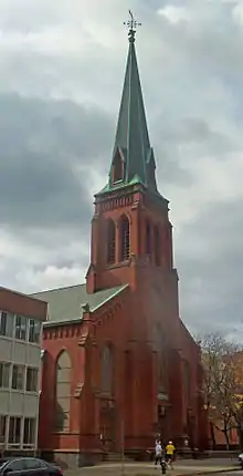 - Trinity United Methodist Church, Lark and Lancaster streets. A 1932 fire destroyed the church that replaced one on this site after a 1901 fire. The church responded later that year by building one of the largest religious building complexes in the city. Philadelphia architects Sunndt and Wenner designed this large limestone building with Neo-Gothic and Art Deco aspects. Elsewhere on the property is a chapel and parish house, the latter incorporating parts of a 1926 building that survived the 1932 fire.[9]: 138