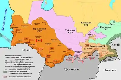 The Red Banner Central Asian Border District (Russian: Краснознамённый Среднеазиатский пограничный округ) was a district of the Soviet KGB Border Guards. It had its headquarters in Ashgabad. It guarded the Afghan-Soviet (without the strip along the Wakhan District) and the Iranian-Soviet border. The sea border of the district extended halfway along the southern line of Soviet territorial waters in the Caspian Sea until it met the terrain of the Red Banner Trans-Caucasus Border District.