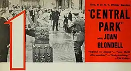 Central Park is a 1932 United States pre-Code feature-length crime drama film directed by John G. Adolfi. This rarely seen film stars Wallace Ford and Joan Blondell and exists in a nitrate print at the Library of Congress. It has seen a DVD release by Teakwood Video.[1][2]