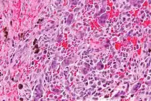 | Micrograph of a central giant cell granuloma showing the characteristic giant cells with surrounding cells that have nuclei that are dissimilar to those in the giant cells. H&E stain. | |
