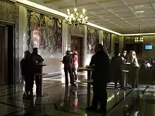 In 1995, the Centre became the headquarters of the World Trade Organization (WTO), that is the current tenant of the building. In 1998 a conference centre was built next to Rue de Lausanne, by the Swiss architect Ugo Brunoni. In 2007, following research conducted at the ILO archives and WTO locations, various hidden artworks were rediscovered and exposed to visitors.[2] After the creation of the WTO, the organization lacked space for staff and delegates for their daily meetings. After considering several options, the Swiss authorities and the WTO have reached an agreement in early August 2008 to renovate, extend and improve the Centre William Rappard. This was the best solution in terms of cost and efficiency. In 2008 the renovation and extension of the building was approved by the Swiss Confederation. Works started in 2009, and added an extension providing 300 new work posts (out of total 1,200 potential places in the whole building) and an underground car park with 200 places).[3] Furthermore, the original building was fully renovated to add more working space for staff members, delegates and visitors. Works were performed in three phases: 2008–2011, renovation of the General Council Room, modernization of infrastructure (electricity, plumbing, heating), and creation of new rooms. 2010–2012, densifying and increasing the indoor capacity, including the Atrium in the former north courtyard and large meeting rooms in the south courtyard. 2011-2013: construction of the new building between the former south parking and the park.