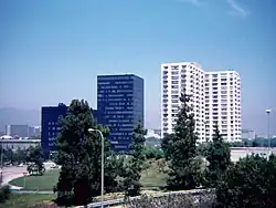 It was designed in the Late Modern architectural style by architects Anthony J. Lumsden and César Pelli.[1][2] Construction was completed in 1969.[1][2][3] It is made up of two buildings: a seventeen-story office tower, and a ten-story hospital.[2][3] The plaza originally housed Century City Hospital, which was owned by Tenet Healthcare Corporation.[4] Tenet closed the hospital in 2004 as it sold it to Salus Surgical Group.[4] The hospital was renamed as Century City Doctors Hospital, which closed in 2008 after filing for bankruptcy.[5] In late 2016, the hospital was remodeled and re-opened as California Rehabilitation Institute, a Cedars Sinai/UCLA partnership providing inpatient rehabilitation and physical therapy.