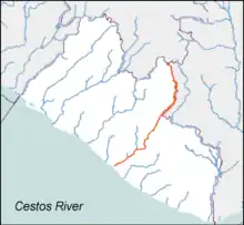 The Cestos River, also known as Nuon or Nipoué river,[1] is a Liberian river that rises in the Nimba Range of Guinea and flows south along the Côte d'Ivoire border, then southwest through tracks of Liberian rain forest to empty into a bay on the Atlantic Ocean where the city River Cess is located. The pygmy hippopotamus (Choeropsis liberiensis) is known to inhabit lands along stretches of the river.[2] It forms the northern third of the international boundary between Liberia and Côte d'Ivoire.