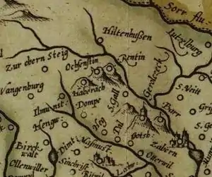 Georges of Ochsnstein, who succeeded his father, Volmar, in 1426, also came into many conflicts. The ransoms he had to collect when he was captured contributed to the ruin of his home. In 1485 after he died, it was his sister Cunegonde, the wife of Henry I of Deux-Ponts-Bitche, who inherited the estate. Guillaume de Ribeaupierre attempted to challenge this legacy by arguing that the Ochsenstein legacy was "masculine" and could not fall to a woman. Henry obtained the backing of the Bishop of Metz for three years (1487 -1490]), before the bishop retracted it.[8]