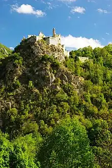 The Château d'Usson is one of the so-called Cathar castles in what is now southwestern France. It is located in the commune of Rouze, in the Ariège département.[1] It is sited upstream from Axat, along the Aude river gorge, carved out of the foothills of the Pyrenees. It is situated at an altitude of 920 metres (3,020 ft) and dominates the valley of the Aude. The Château de Puilaurens is 30 kilometres (19 mi) away, Château de Puivert 49 kilometres (30 mi) and Château de Quéribus 60 kilometres (37 mi).