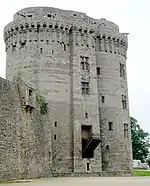 It is called Donjon de la duchesse Anne (Keep of the Duchess Anne), and stands 111 feet (34m) high near the Saint Louis gate. John V, Duke of Brittany built the keep in 1382–1383. The keep is formed by a union of two tall circular towers; a moat and drawbridge divides the keep from the outside of the ramparts as well as from the inside of the city, providing a stronghold both against outsiders and from the townspeople themselves.[1] Extensive machicolations overhang the wall head providing defensive coverage of the base of the tower.