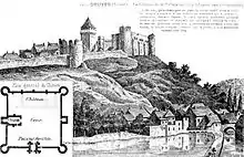 The top of the hill is flat and triangular, measuring about 300 meters wide, and surrounded by a wall. The town was typically accessed by a postern (secondary gate), located at the northern tip of the triangle, where the slope is more gentle. The plateau overlooks the valley and its shape made the castle practically impenetrable at the time it was built. The wall was defended by the towers (Bonnon tower or Jean Martin tower) with an outside ditch and a wooden palisade at the more vulnerable areas.