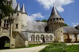 The Château de Javarzay combines both Renaissance and feudal aspects with its machicolations and its moat as well as conical roofs covered with slate. Its entrance pavilion is flanked by four corbelled turrets.