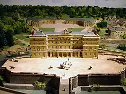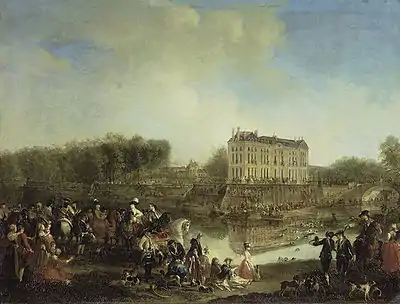'Michel Barthélemy Ollivier, Fête give by le Prince Louis François de Conti in honour of Charles William Ferdinand, Hereditary Prince of Brunswick-Lüneburg in 1766 : the deer take the water in front of the château.[1]