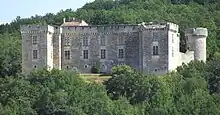 The castle exhibits military architecture of the 14th and 15th centuries. It was restored at the end of the 16th century after it was ruined in 1580 during its capture by Protestant troops. Originally a simple watch tower, the square plan castle is flanked by two massive square towers in the west and two round towers in the east. It comprises a rectangular corps de logis extended by two wings and a curtain wall in the south which encloses the courtyard. The north wing (former stables), having been used as a source of stones to build the house of a former owner, was equipped with an open gallery to ensure weatherproofing. The structure was served by a right handed staircase. The two square towers still have the latrines in the corner made with the corps de logis. The castle was sold as state property in 1793.[1]