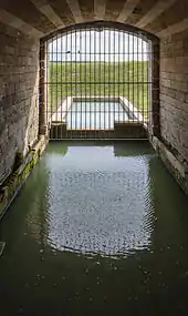 By reflecting the image of the château, the nymphaeum acts as a unifying element between the gardens and château. The vault of the basin is made of segments of alternating color. The exterior as well as the lintels of Level 1, is rusticated. In original plans of Du Cerceau, it is shown surrounded by bleachers forming a small theater. Yet the archaeological excavations suggest this was never present and the original plan for the nymphaeum was simplified. The current theories suggest a terrace wall separated the enclosed basin from the rest of the garden, interrupted by an access staircase. The plan of Du Cerceau could have corresponded to a project of later development that never came to fruition due to the abandonment of the site or the death of Antoine de Crussol. The nymphaeum was completely restored in 2012.[3]