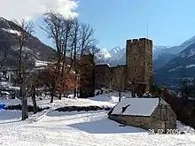 Perched on the summit of a rocky outcrop, it was over the centuries a true strategic site for the protection of the valley and also a place of refuge for the population. Its construction dates from the 10th century by the Count of Bigorre, Centule III,[2] Its origin, however, seems older because the Arabs would have occupied it.[4] In the 14th century, it was occupied by the Knights Hospitaller.[5] Then the English took possession until 1404, when Jean de Bourbon, the Count of Clermont,[6] helped by the inhabitants of the valley commanded by Aougé de Coufitte, drove them out and put an end to the English occupation of the valley.[4] The castle was then gradually abandoned.[2]