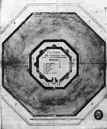 Archive documents from 1749 indicate the presence of a castle built on an octagonal plan. Originally, it comprised a central keep, surrounded by an octagonal enceinte and a moat. Inside, the residences of the servants and cattle sheds were against the enclosing wall. In the 15th century, semicircular towers were added to each side of the octagon, one of them replacing the keep. The moat was widened to 23 metres and second octagonal fortified wall added, giving a total diameter of 101 metres.[1]