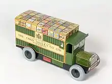 A tin-plate Chad Valley toy truck, displaying their royal warrant.