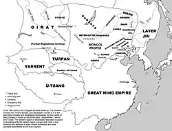 ![]() The Chagatai Khanate, with contemporary polities circa 1300, before the expansion of the Timurid Empire into Transoxonia from 1363.[3] | |||||||||||||||