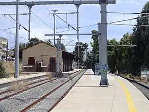 Chalcis railway station (Greek: Σιδηροδρομικός σταθμός Χαλκίδος, romanized: Sidirodromikos stathmos Chalkídos) is a railway station in the city of Chalcis, in Euboea, Greece. Opened on 8 March 1904, it is now the northern terminus station of the Athens - Chalcis service of Proastiakos.[3] The station sits close to the waterfront, with a small promenade running parallel to the platforms. It is owned by OSE, but services are provided by Hellenic Train through the Athens Suburban Railway to Oinoi and Athens.