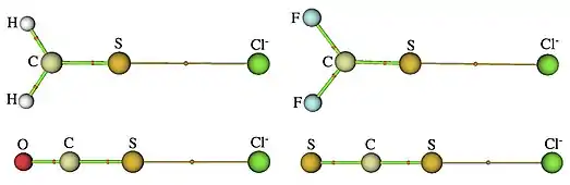 Any electron donor can donate electrons into the σ-hole of a bonded chalcogen, including halogen anions, amines, and π electrons (such as benzene). Similar to halogen bonding, chalcogen bonding can occur between two chalcogens, resulting in a chalcogen-chalcogen bond. Non-covalent interactions are well characterized by Bader's atoms in molecules (AIM) model which defines a bond as any bond-critical point (BCP) existing between two nuclei.[1] This can be understood simply as a saddle point on an electron density map of a molecule. Hydrogen and halogen bonds are both well characterized by this method. The same analysis has been performed on chalcogen bonds, as shown below. The BCP's between S and Cl− in these molecules are evidence of the non-covalent interactions, in this case chalcogen-halogen bonds.[9]