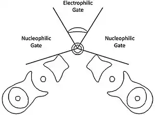 Given the dual ability of chalcogens to serve as donor and acceptor molecules for σ-hole interactions, a geometric schematic has been generated to distinguish between the differing bonding character. The σ* orbital is exactly opposite the σ bonds to a chalcogen bond. It is the region between the σ-holes in which the lone pairs localize in a donor region. These regions have been referred to as the nucleophilic gate, the σ-hole regions which are electron depleted, and the electrophilic gate, the donor region which is electron enriched.[8]