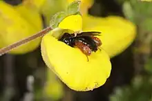 A single floral visit extends for a minimum of 30 seconds. Chalepogenus bees initiate their visit by landing on the labellum and search for the flower's opening. Once they have found it, the bees use their heads to push aside the hindmost part of the two anthers, thereby revealing the previously hidden frontal section that contains Calceolaria pollen. The bees become dorsally coated with this pollen during this process; in other words, they pollinate Calceolaria flowers nototribically. As they collect oil with their forelegs, the majority of their bodies remains hidden within the labellum, with only their hindlegs visible from outside. Upon completing their oil collection, the bees back out and ipsilaterally transfer the collected oil from forelegs, to middle legs, then to hindlegs.[2][3][5]