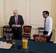 Johnson and Sunak at the former's birthday celebration on 19 June 2020; both men later received fixed penalty notices for attending the gathering