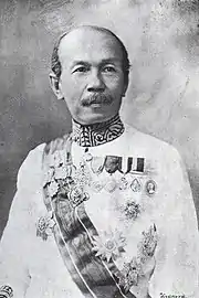 Born in Suphan Buri, Pan was raised as a novice Buddhist monk in Bangkok and left the monkhood to join government service around the age of 21, becoming a teacher at the royal palace school and then a tutor to Chulalongkorn's children studying in England, where he served as a diplomat for 11 years. He then became commissioner of Monthon Nakhon Si Thammarat under the new monthon administration system for 12 years, and was later appointed to several successive ministerships in the reformed government system: those of Public Works, Metropolitan Affairs, and Interior. He oversaw various modernizing public works projects, including the introduction of electricity and waterworks in the capital and the establishment of a modern police force, and also established the country's first cement factory (now Siam Cement Group). He was elevated to the highest noble rank of chaophraya, receiving the title Yommarat, in 1908. He retired from public office in 1926, but was later appointed regent to the young King Ananda Mahidol (Rama VIII) in 1935, holding the position until his death in 1938.[1][2]