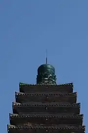 The eaves portion of the tower has 13 floors in total, the first to the eleventh floors having been transformed from the eaves of the fourth to the fourteenth floors of the Sui Tang Pagoda, and the twelfth and thirteenth floors having been both reconstructed in the Liao Dynasty. The first floor is an imitation wood, brick arch with a large eave which is 1.64 meters high and 1.96 meters out. From the second story onwards, the eaves of the tower are gradually divided. Above the eaves, part of the tower is the tower brake. The base of this pagoda is a brick octagonal rosette. The rosette is surmounted by a girdle and a green glass glazed rosette with an overlapping bowl above the rosette.[1][3]